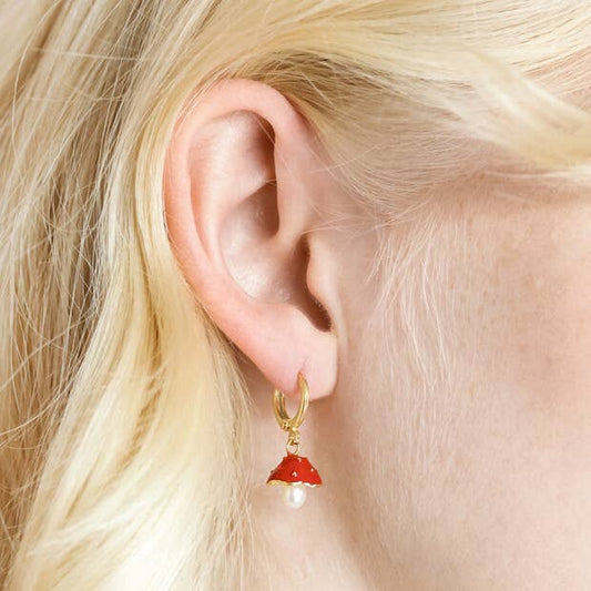 Enamel Toadstool and Pearl Huggie Hoop Earrings