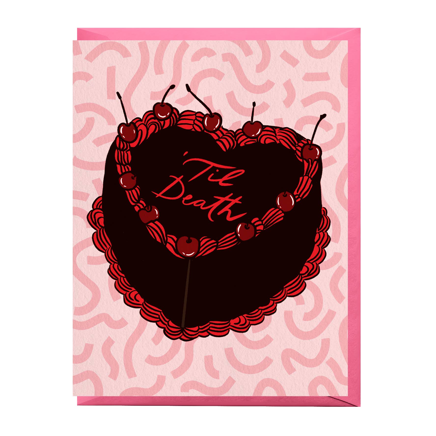 Card reads "Til Death" and features a heart-shaped black cake with cherries.